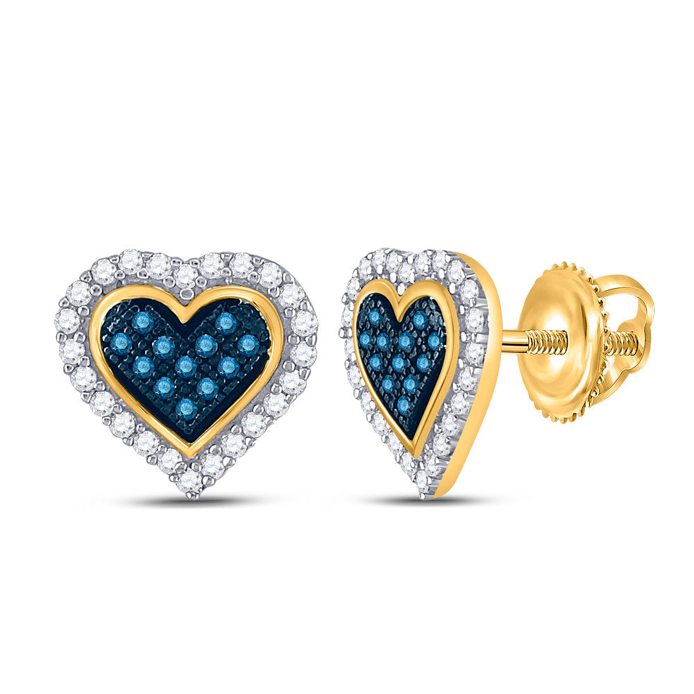 10kt Yellow Gold Womens Round Blue Color Enhanced Diamond Heart Stud Earrings 1/4 Cttw