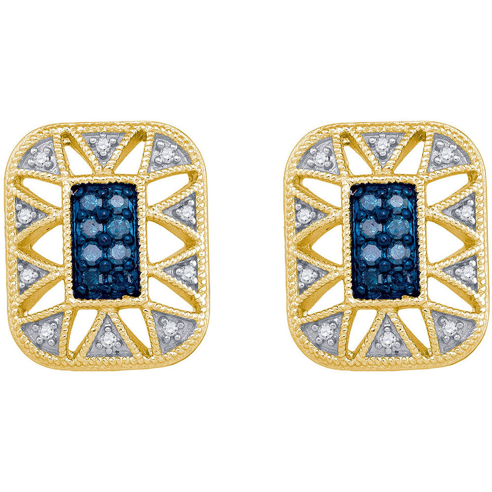 10kt Yellow Gold Womens Round Blue Color Enhanced Diamond Rectangle Cluster Earrings 1/4 Cttw
