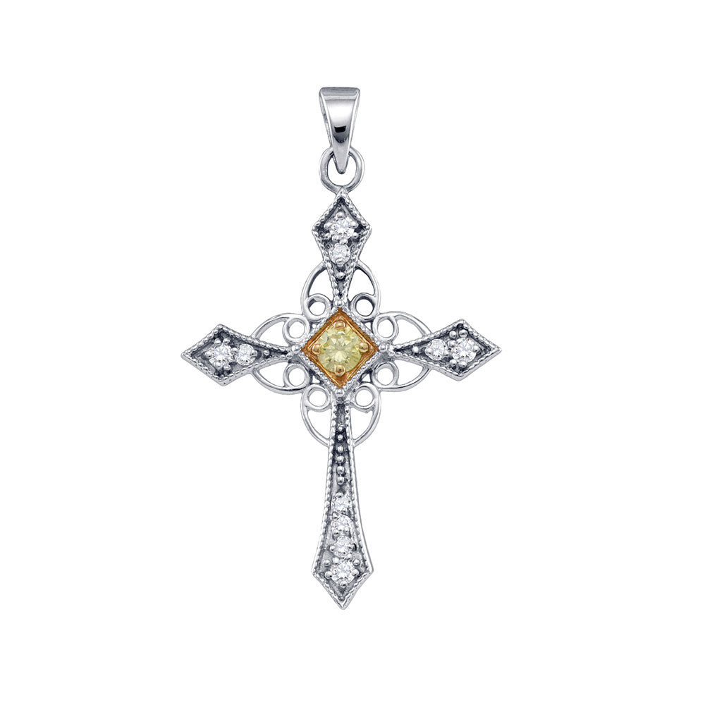 10kt White Gold Womens Round Yellow Color Enhanced Diamond Cross Pendant 1/3 Cttw