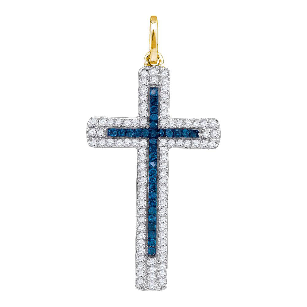 10kt Yellow Gold Womens Round Blue Color Enhanced Diamond Roman Cross Pendant 1/4 Cttw