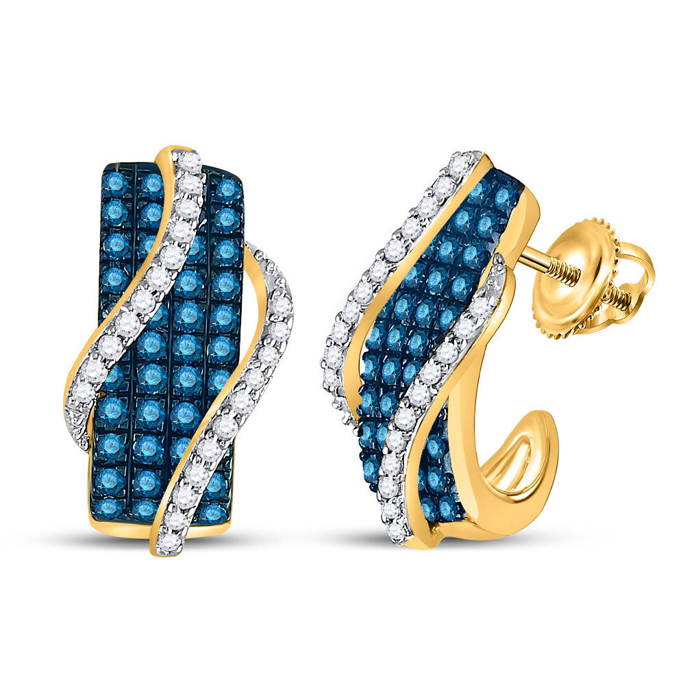 10kt Yellow Gold Womens Round Blue Color Enhanced Diamond Half J Hoop Earrings 1 Cttw