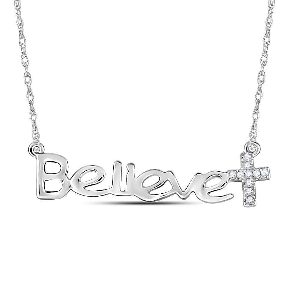 14kt White Gold Womens Round Diamond Believe Cross Necklace 1/20 Cttw