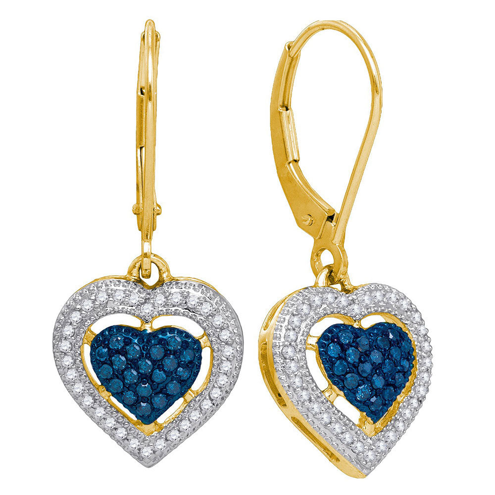10kt Yellow Gold Womens Round Blue Color Enhanced Diamond Heart Dangle Earrings 3/8 Cttw