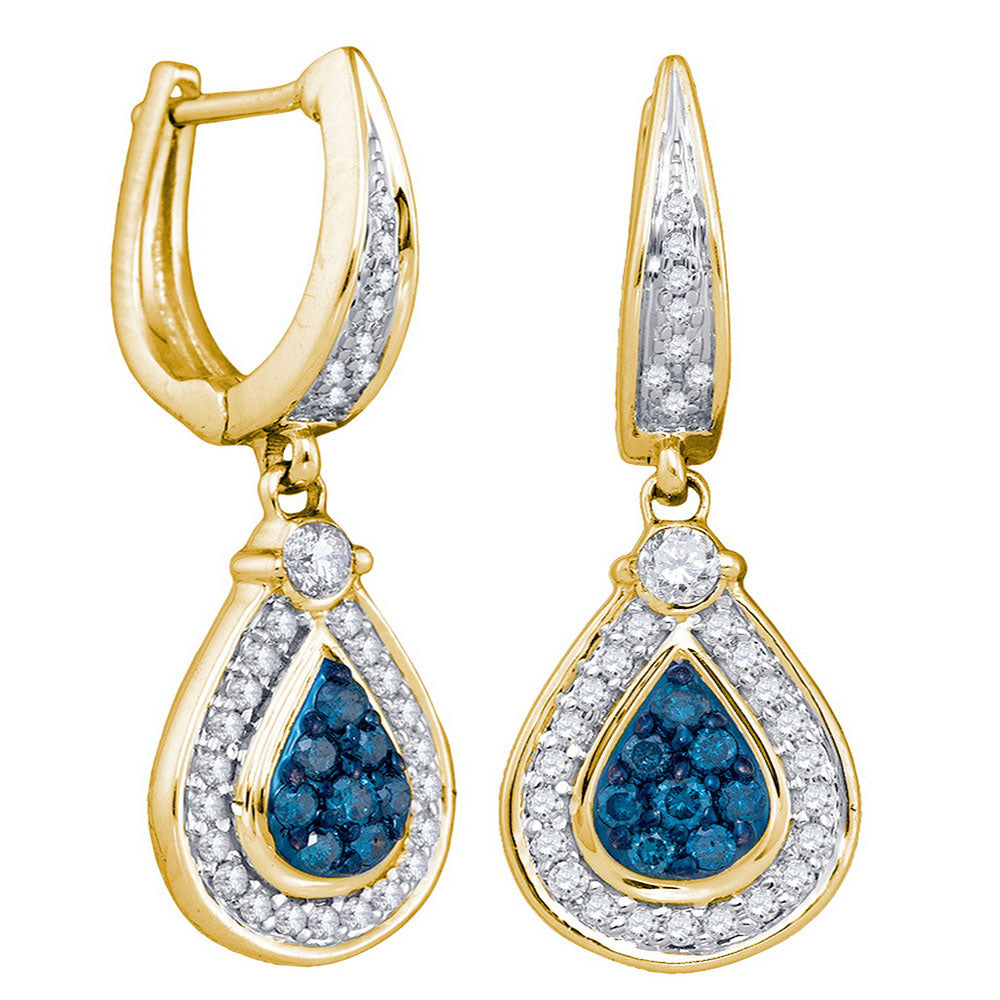 10kt Yellow Gold Womens Round Blue Color Enhanced Diamond Teardrop Dangle Earrings 1/2 Cttw