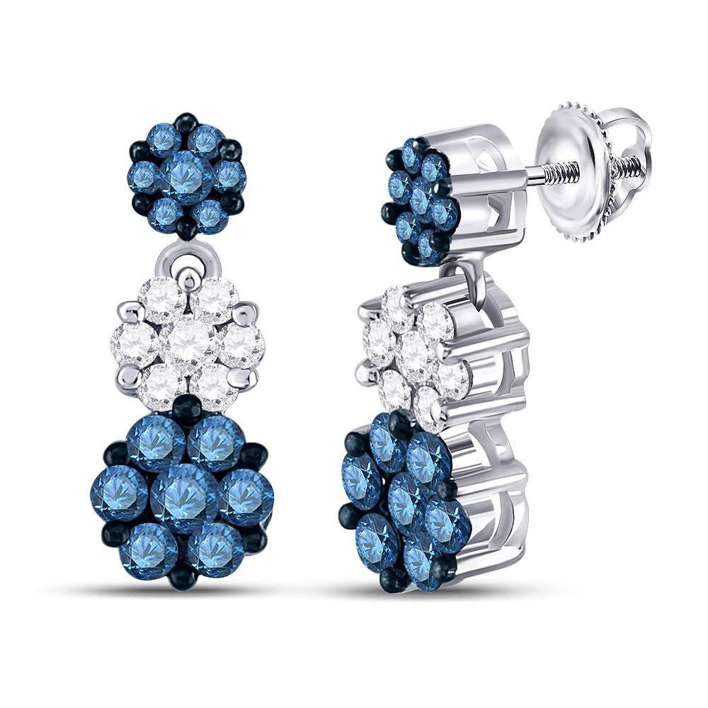 14kt White Gold Womens Color Enhanced Blue Diamond Triple Cluster Dangle Earrings 2 Cttw