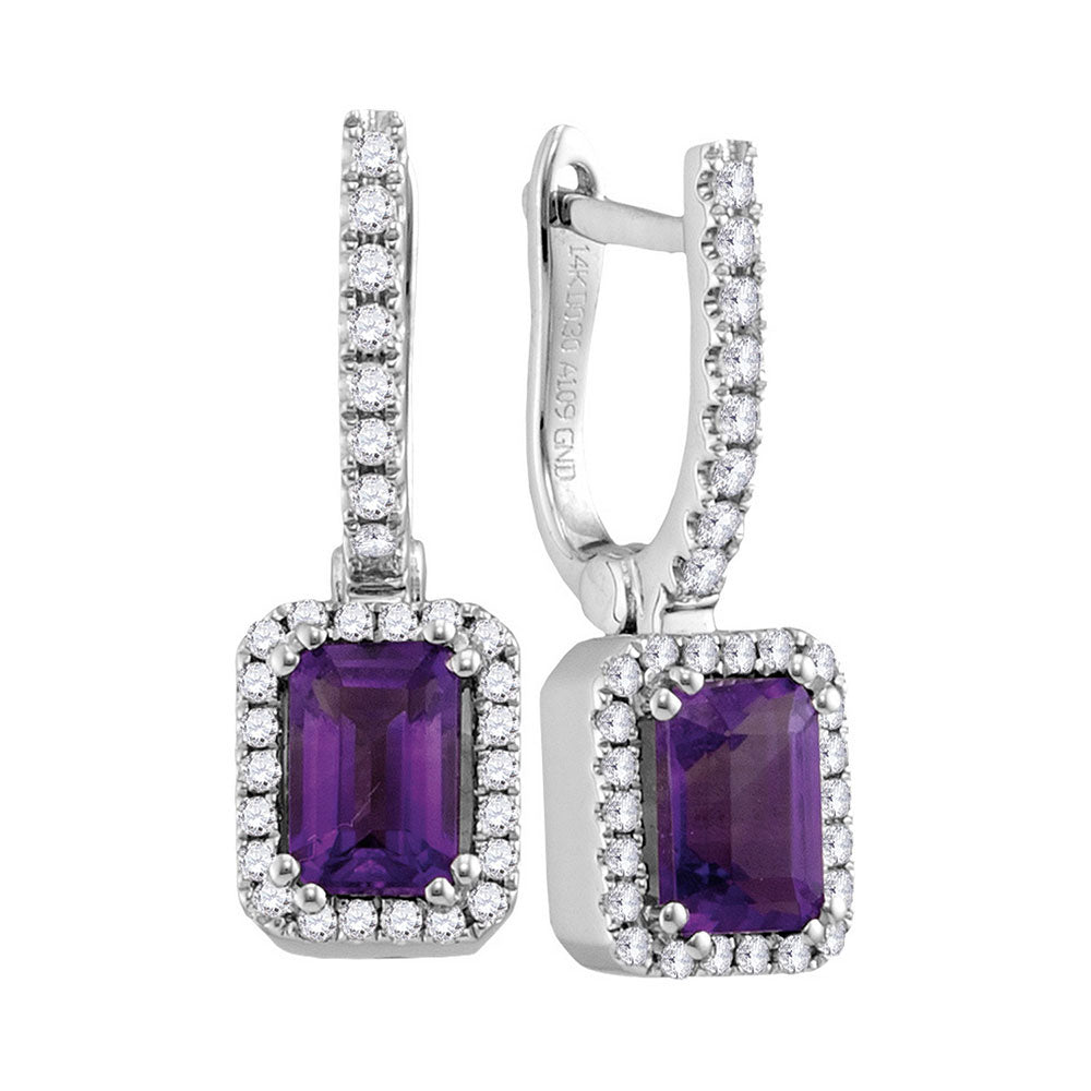 14kt White Gold Womens Cushion Amethyst Solitaire Diamond Frame Hoop Dangle Earrings 1/3 Cttw