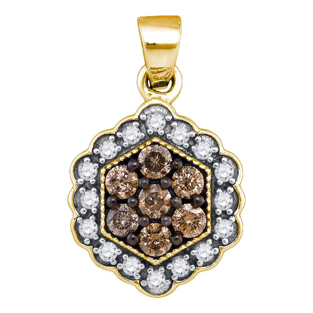 10kt Yellow Gold Womens Round Brown Diamond Hexagon Flower Cluster Pendant 1/2 Cttw
